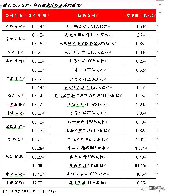 目前,在2017年的行業(yè)并購中,大致可以分為兩類:①以東江環(huán)保為首的環(huán)保行業(yè)之間的并購,其中東江環(huán)保和雪浪環(huán)境分別發(fā)生3起并購,在整個并購熱潮中居前列;②以金圓股份為首的跨行業(yè)并購。環(huán)保公司為了擴大公司業(yè)務(wù)范圍,或增加產(chǎn)能資質(zhì),收并購危廢處置企業(yè),加快無害化、資源化產(chǎn)能布局。一般來說,危廢設(shè)施的建設(shè)周期較長,從環(huán)評到實際真正投產(chǎn)運營至少需要2-3年左右時間,而通過收并購的方式,可以令公司快速擁有或擴大處置危廢的能力。并且對于危廢的處置跨省轉(zhuǎn)移運輸過程中存在的風(fēng)險較大,通常采用就地處置的方式,公司通過跨省并購也可以實現(xiàn)公司的省外業(yè)務(wù)擴張。