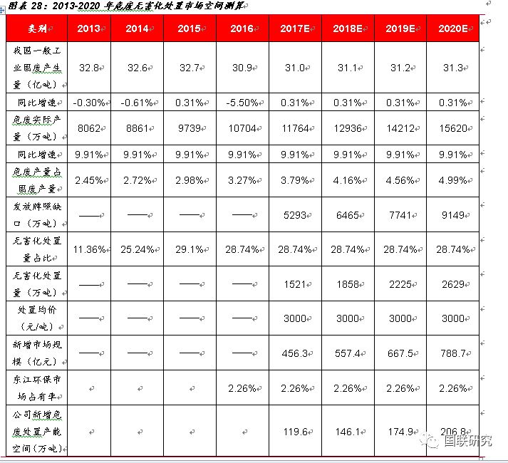無害化處置市場潛力巨大,公司成長空間廣闊。我們預(yù)計在2018-2020年,全國危廢實際產(chǎn)量將會持續(xù)增長,約為1.3-1.56億噸,截至2016年底,全國各省(區(qū)、市)頒發(fā)的危廢(包含醫(yī)療廢物)經(jīng)營許可證共計2195份,核準(zhǔn)經(jīng)營規(guī)模為6471萬噸/年(含收集經(jīng)營規(guī)模397萬噸/年)。我們通過測算未來危廢實際產(chǎn)量與現(xiàn)有核準(zhǔn)規(guī)模的缺口,按無害化處置比例28.74%,3000元/噸的平均處置價格進行測算,則預(yù)計到2020年,危廢無害化處置行業(yè)缺口將有望達(dá)到788.7億元。對于東江環(huán)保,2016、2017年危廢處置總產(chǎn)能分別為146萬噸、160萬噸,按照16年核準(zhǔn)經(jīng)營規(guī)模6471萬噸/年進行計算,市場占有率在2.26%,假設(shè)市占率保持不變,對應(yīng)的公司2020年新增危廢處置總產(chǎn)能的空間(包含資源化、無害化)大約是206.8萬噸,合計總產(chǎn)能規(guī)模達(dá)到352.8萬噸,較目前公司的產(chǎn)能規(guī)模160萬噸仍有較大的增長空間。