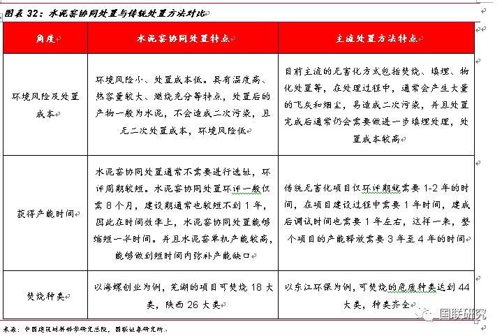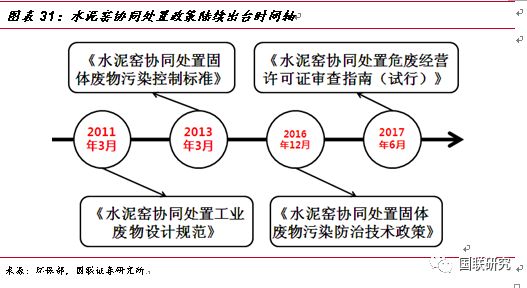 水泥窯協(xié)同處置—危廢無害化處置的有益補充。政策刺激下,水泥窯協(xié)同處置危廢應(yīng)運而生。2011年3月,《水泥窯協(xié)同處置工業(yè)廢物設(shè)計規(guī)范》正式出臺,文件對工業(yè)廢物處置規(guī)模、技術(shù)等進行了詳細(xì)要求,標(biāo)志著對水泥窯協(xié)同處置政策成熟化的開端。2013年兩高司法提出非法排放、傾倒、處理3噸以上的危廢入刑,從法律層面上對危廢的排放進行了強有力的監(jiān)管,同年3月,《水泥窯協(xié)同處置固體廢物污染控制標(biāo)準(zhǔn)》出臺,規(guī)定了污染排放限值、水泥窯設(shè)施技術(shù)要求以及入窯廢物的特性要求,作為水泥窯協(xié)同處置領(lǐng)域規(guī)范性文件推動了行業(yè)的持續(xù)發(fā)展。2016年12月,《水泥窯協(xié)同處置固體廢物污染防治技術(shù)政策》出臺,文中明確了協(xié)同處置固廢應(yīng)利用現(xiàn)有新型干法水泥窯,采用窯磨一體化的運行方式進行運作,政策發(fā)布之后,新建、改建或擴建處置危險廢物的水泥企業(yè),應(yīng)按照要求選擇單線設(shè)計熟料生產(chǎn)規(guī)模 4000噸/日及以上水泥窯。2017年6月,《水泥窯協(xié)同處置危廢經(jīng)營許可證審查指南(試行)》出臺,對水泥窯協(xié)同處置危廢的適用范圍、術(shù)語定義、經(jīng)營模式及技術(shù)規(guī)范等方面進行了詳細(xì)規(guī)定,并將協(xié)同處置的新型干法水泥窯熟料產(chǎn)能的標(biāo)準(zhǔn)重新進行了修訂,由之前4000噸/日調(diào)整下降到2000噸/日,進一步擴大了產(chǎn)能空間。