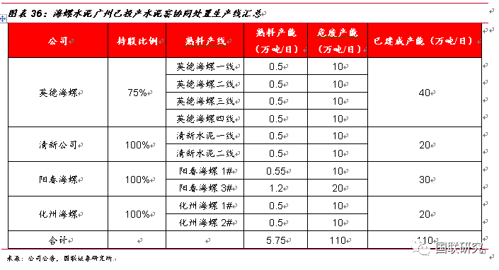 以廣東省為試點,公司攜手海螺創(chuàng)業(yè)深耕危廢領(lǐng)域。公司與海螺創(chuàng)業(yè)將以包括但不限于股權(quán)合作的方式進行廣東省水泥窯協(xié)同處置固廢布點,包括但不限于以《廣東省環(huán)境保護“十三五”規(guī)劃》和《廣東省水泥行業(yè)轉(zhuǎn)型升級技術(shù)路線和行動計劃(2016-2018年)》為指導(dǎo)。根據(jù)“十三五”期間規(guī)劃要求,廣東省水泥窯協(xié)同處置危廢產(chǎn)能為500萬噸/年,據(jù)海螺水泥公司公告統(tǒng)計,其在廣東省內(nèi)共計有4家子公司,分別為英德海螺、清新水泥、化州海螺以及陽春海螺,共計10條投產(chǎn)線,已建成熟料產(chǎn)能分別為2萬噸/日、1萬噸/日、1萬噸/日以及1.75萬噸/日,若全部完成協(xié)同改造,危廢產(chǎn)能總計將達(dá)110萬噸/年。