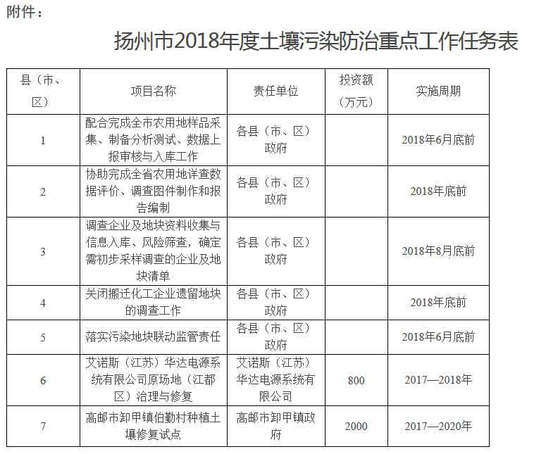 附件:揚州市2018年度土壤污染防治重點工作任務表
