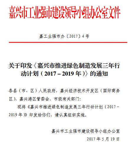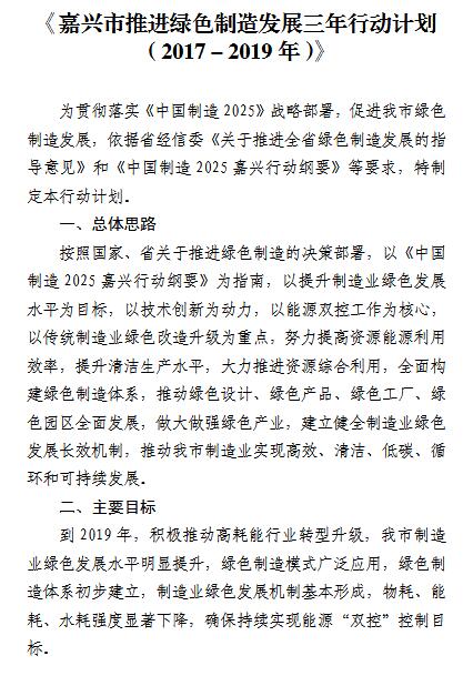 日前浙江省嘉興市正式出臺《嘉興市推進綠色制造三年行動計劃》,以加快綠色制造行動在嘉興市的貫徹落實,提升全市制造業(yè)綠色化發(fā)展水平。