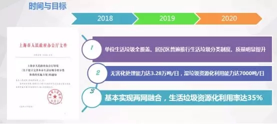 今年4月份,上海發(fā)布《上海市生活垃圾全程分類體系建設(shè)行動計劃(2018-2020年)》(下稱《行動計劃》),根據(jù)《行動計劃》,到2020年底,基本實現(xiàn)單位生活垃圾強制分類全覆蓋,居民區(qū)普遍推行生活垃圾分類制度,生活垃圾分類質(zhì)量明顯提升。生活垃圾綜合處理能力達到3.28萬噸/日以上,其中,濕垃圾資源化利用能力達到7000噸/日,基本實現(xiàn)兩網(wǎng)融合,生活垃圾資源回收利用率達到35%以上。