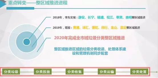 在原來一個小區(qū)、一個單位零散推進的基礎(chǔ)上,實施整街鎮(zhèn)或整行政區(qū)推進垃圾分類,構(gòu)建既完整又具有規(guī)?;氖占\輸處置管理鏈。2018年靜安、長寧、楊浦、松江、奉賢、崇明6個區(qū)實現(xiàn)整區(qū)域推進,2019年黃浦、徐匯、普陀、閔行、嘉定、金山6個區(qū)實現(xiàn)整區(qū)域推進,2020年全市全面實現(xiàn)整區(qū)域推進。