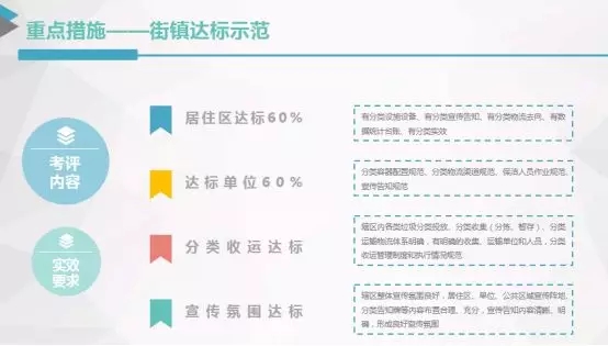根據(jù)《上海市生活垃圾分類達標(biāo)、示范街道(鎮(zhèn)、鄉(xiāng))考評辦法(試行)》,要成為生活垃圾分類達標(biāo)街鎮(zhèn),其轄區(qū)內(nèi)60%的居住區(qū)和單位先要達標(biāo),轄區(qū)內(nèi)各類垃圾的分類投放、收集(分揀、暫存)、運輸物流體系明確,還要建立垃圾分類領(lǐng)導(dǎo)和協(xié)調(diào)機制,落實居住區(qū)垃圾分類居委、物業(yè)、業(yè)主、第三方的責(zé)任人和所負(fù)責(zé)任。成為生活垃圾分類示范街鎮(zhèn)的門檻更高,轄區(qū)內(nèi)80%的居住區(qū)和單位生活垃圾分類實效要達標(biāo)。