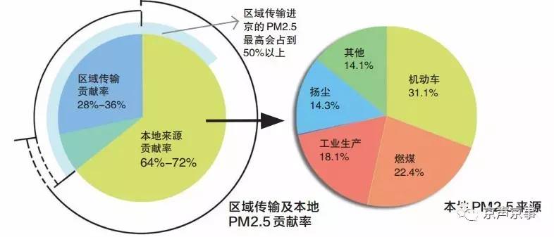 2014年4月,北京正式發(fā)布PM2.5來(lái)源解析最新研究成果:全年P(guān)M2.5來(lái)源中,區(qū)域傳輸貢獻(xiàn)約占28%至36%,本地污染排放貢獻(xiàn)占64%至72%。在本地污染貢獻(xiàn)中,機(jī)動(dòng)車(chē)排放比例最高,達(dá)31.1%。一些特定空氣重污染過(guò)程中,通過(guò)區(qū)域傳輸進(jìn)京的PM2.5會(huì)占到總量的50%以上。
