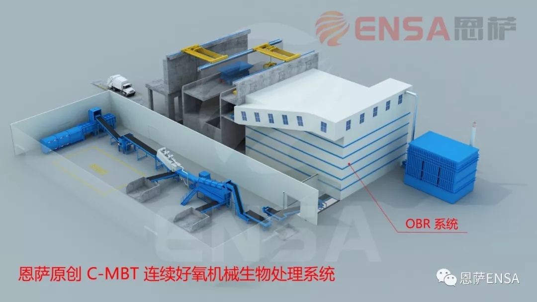 為解決上述問題,恩薩原創(chuàng)性地提出大規(guī)模智能連續(xù)好氧機械生物處理技術(shù)(以下簡稱“C-MBT”,即:Continuous Mechanical Biological Treatment),即采用 OBR 連續(xù)高效好氧生物反應(yīng)器(恩薩專利)技術(shù)(以下簡稱“OBR”, 即:Oxic Bio-Reactor ),針對已經(jīng)過初步破碎預(yù)處理后的生活垃圾等物料,在封閉的環(huán)境下,以連續(xù)進出料和自動翻拋的方式持續(xù)好氧發(fā)酵的過程,從而在相對較短的發(fā)酵時間內(nèi)持續(xù)獲得較低含水率的高熱值物料。