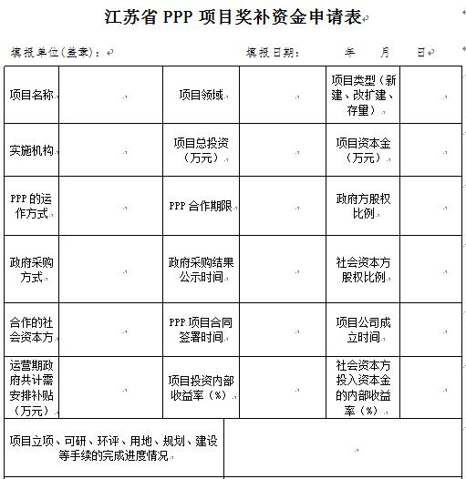 附表:江蘇省PPP項(xiàng)目獎(jiǎng)補(bǔ)資金申請(qǐng)表