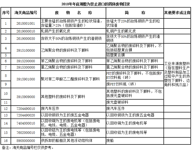 附件:1.2018年年底調(diào)整為禁止進(jìn)口的固體廢物目錄