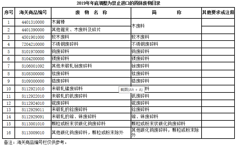 二、將不銹鋼廢碎料、鈦廢碎料、木廢碎料等16個(gè)品種固體廢物(見(jiàn)附件2),從《限制進(jìn)口類可用作原料的固體廢物目錄》《非限制進(jìn)口類可用作原料的固體廢物目錄》調(diào)入《禁止進(jìn)口固體廢物目錄》,自2019年12月31日起執(zhí)行。