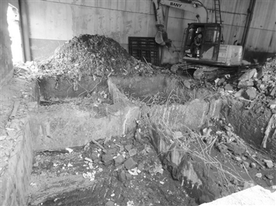 環(huán)境執(zhí)法人員在常熟市古里鉚焊廠有限公司表面處理車(chē)間內(nèi)開(kāi)挖出表面設(shè)施下位池。黃駿 攝