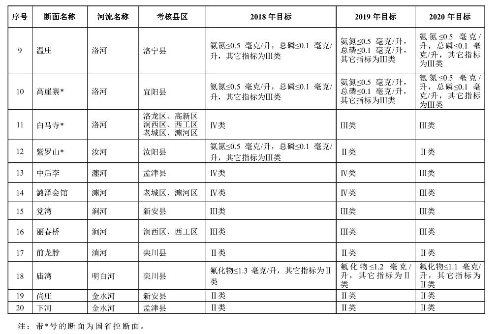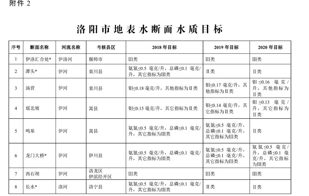 3. 2020 年度目標(biāo) 全市氮氧化物減排 30220 噸,二氧化硫減排 27880 噸。全市 PM 2.5 (細(xì)顆粒物)年均濃度達(dá)到 54 微克/立方米以下,PM 10 (可吸入顆粒物)年均濃度達(dá)到 95 微克/立方米以下,城市區(qū)優(yōu)良天數(shù)達(dá)到 260 天以上。偃師市、孟津縣、新安縣、伊川縣、宜陽縣、吉利區(qū) PM 2.5 年均濃度達(dá)到 45 微克/立方米以下,汝陽縣、洛寧縣、欒川縣、嵩縣 PM 2.5 年均濃度達(dá)到 35 微克/立方米以下。全市地表水國、省重點監(jiān)控的 7 個斷面達(dá)到或優(yōu)于Ⅲ類水質(zhì)斷面比例保持 100%,其中伊河潭頭、洛河長水、汝河紫羅山斷面水質(zhì)保持或優(yōu)于Ⅱ類;市重點監(jiān)控斷面達(dá)到或優(yōu)于Ⅲ類水質(zhì)斷面比例達(dá)到 100%,其中伊河鳴皋斷面水質(zhì)達(dá)到或優(yōu)于Ⅱ類;全市縣級以上城市集中式飲用水水源地取水水質(zhì)達(dá)標(biāo)率達(dá)到 100%;全面消除縣城建成區(qū)黑臭水體,基本消除農(nóng)村地區(qū)黑臭水體、坑塘;地下水質(zhì)量考核點位水質(zhì)級別保持穩(wěn)定。