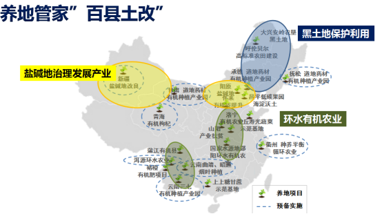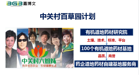 接下來,講一下中關(guān)村百草園的案例。在國際中藥材市場,中國的中藥占有率不到0.2%,日、韓是85%,他們在國際市場的中藥多是在中國種植的,但標(biāo)準(zhǔn)不一樣,關(guān)鍵就是高碳低氮健康土壤的培育。于是,我們在中關(guān)村發(fā)起了一個百草園計劃,成立了有機(jī)道地藥材研究院,用中醫(yī)思想解決中藥問題,其中最主要的就是有機(jī)質(zhì)安全、高效、標(biāo)準(zhǔn)化利用,標(biāo)準(zhǔn)化農(nóng)時管理。我們和北師大北中醫(yī)國家大學(xué)科技園等機(jī)構(gòu)共同成立這個研究院,作為一個平臺,這也是中關(guān)村六姐妹們共同為有機(jī)中藥做的一個平臺,建立100個有機(jī)道地藥材研究基地,它的第一個服務(wù)對象是中關(guān)村的生物制藥企業(yè),我們將在國家貧困縣做100個有機(jī)道地藥材項目,成為藥企自有藥材基地的運(yùn)營服務(wù)商。