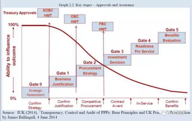 可見,物有所值是PPP項目的核心原則,應(yīng)貫穿在PPP項目實施的全過程動態(tài)管理中,根據(jù)項目關(guān)鍵要素的變化不斷測算、評估和調(diào)整,特別是項目采購和融資交割后,談判簽約的實際情況往往與項目準備時發(fā)生變化,應(yīng)對基于可研報告和項目實施方案所做的物有所值評估進行核算,同時在項目實施期和結(jié)束后的每個重大變化節(jié)點,都應(yīng)開展相應(yīng)的評估工作。英國在PPP項目全過程審查評估中就明確了評估的五個關(guān)鍵關(guān)口(Gate)。