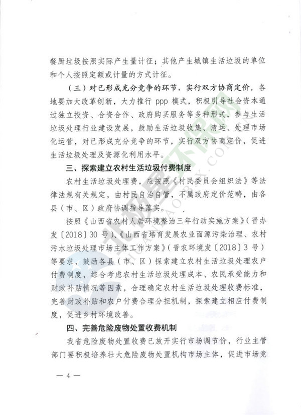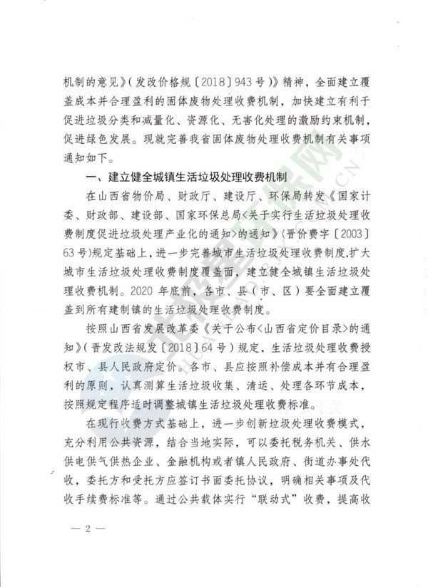中國(guó)固廢網(wǎng)獲悉,日前山西省發(fā)展和改革委員會(huì)、山西省財(cái)政廳、山西省住房和城鄉(xiāng)建設(shè)廳、山西省生態(tài)環(huán)境廳、山西省衛(wèi)生健康委員會(huì)聯(lián)合下發(fā)《關(guān)于完善固體廢物處理收費(fèi)機(jī)制的通知》,明確提出按照污染者使用者付費(fèi)、保護(hù)者節(jié)約者受益的原則,積極推進(jìn)城鎮(zhèn)生活垃圾處理收費(fèi)方式改革。