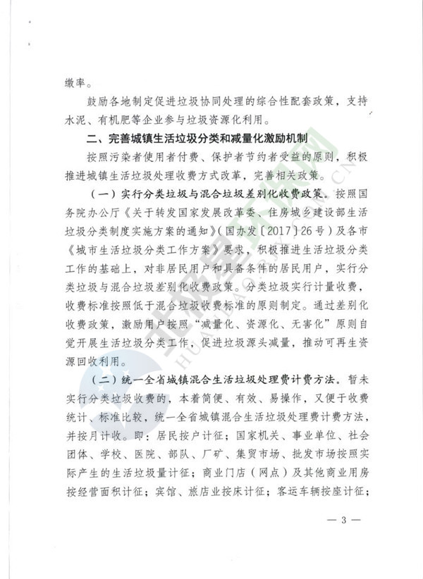 在積極推進(jìn)生活垃圾分類(lèi)工作的基礎(chǔ)上,對(duì)非居民用戶(hù)和具備條件的居民用戶(hù),實(shí)行分類(lèi)垃圾與混合垃圾差別化收費(fèi)政策。分類(lèi)垃圾實(shí)行計(jì)量收費(fèi),收費(fèi)標(biāo)準(zhǔn)按照低于混合垃圾收費(fèi)標(biāo)準(zhǔn)的原則制定。通過(guò)差別化收費(fèi)政策,激勵(lì)用戶(hù)按照“減量化、資源化、無(wú)害化”原則自覺(jué)開(kāi)展生活垃圾分類(lèi)工作,促進(jìn)垃圾源頭減量,推動(dòng)可再生資源回收利用。暫未實(shí)行分類(lèi)垃圾收費(fèi)的,統(tǒng)一全省城鎮(zhèn)混合生活垃圾處理費(fèi)計(jì)費(fèi)方法,并按月征收。即:居民按戶(hù)計(jì)征;國(guó)家機(jī)關(guān)、事業(yè)單位、社會(huì)團(tuán)體、學(xué)校、醫(yī)院、部隊(duì)、廠礦、集貿(mào)市場(chǎng)、批發(fā)市場(chǎng)按照實(shí)際產(chǎn)生的生活垃圾量計(jì)征;商業(yè)門(mén)店(網(wǎng)點(diǎn))及其他商業(yè)用房按經(jīng)營(yíng)面積計(jì)征;賓館、旅店業(yè)按床計(jì)征;客運(yùn)車(chē)輛按座計(jì)征;餐廚垃圾按照實(shí)際產(chǎn)生量計(jì)征;其他產(chǎn)生生活垃圾的單位和個(gè)人按照定額或計(jì)量的方式計(jì)征。