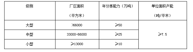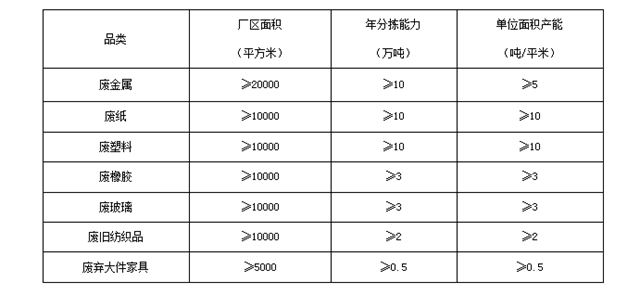 指分揀品類不少于二類,分揀能力和用地面積規(guī)劃設(shè)計(jì),應(yīng)以再生資源分揀用地標(biāo)準(zhǔn)和本區(qū)域再生資源實(shí)際產(chǎn)生量為準(zhǔn)??煞譃榇蟆⒅?、小型三個(gè)級(jí)別,各級(jí)別綜合型分揀中心的年分揀能力和廠區(qū)面積如下: