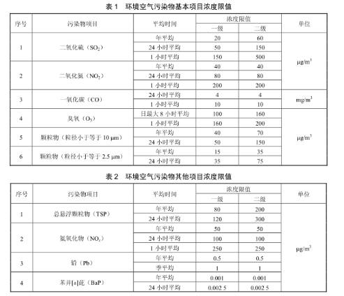 第4.2條:環(huán)境空氣功能區(qū)質(zhì)量要求:一類區(qū)適用一級排放濃度限值,二類區(qū)適用二級濃度排放限值。一、二類區(qū)環(huán)境空氣功能區(qū)質(zhì)量要求見表1和表2:
