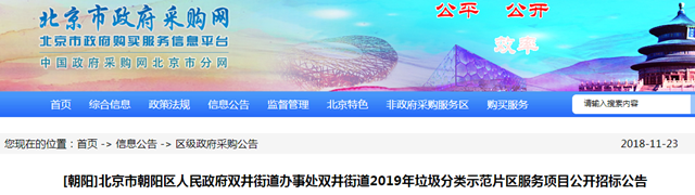 2018年11月23日,北京市朝陽(yáng)區(qū)雙井街道2019年垃圾分類示范片區(qū)服務(wù)項(xiàng)目發(fā)布公開招標(biāo)公告。