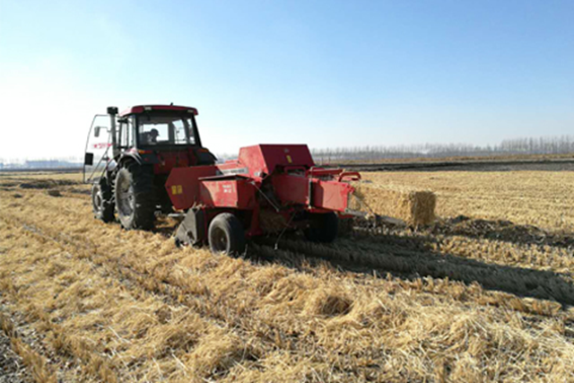圖為水稻秸稈打捆現(xiàn)場應用“夢創(chuàng)”圓捆9YG—1.3型打捆機,每小時可打水稻秸稈捆20捆,每捆重量約為230KG。