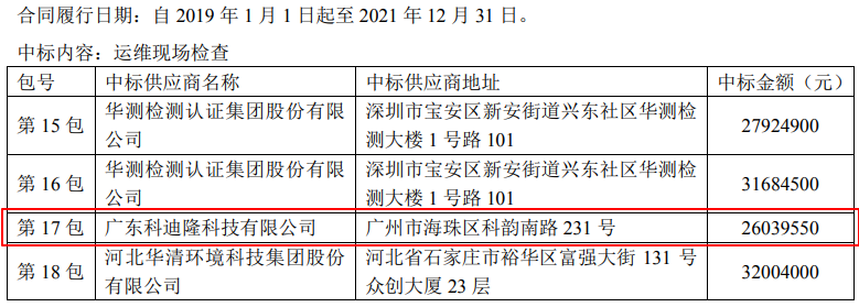 11月15日,中國環(huán)境監(jiān)測總站“國家環(huán)境空氣監(jiān)測網(wǎng)城市環(huán)境空氣自動(dòng)監(jiān)測站運(yùn)行維護(hù)項(xiàng)目”對(duì)外公布中標(biāo)結(jié)果。前19包招標(biāo)成功,總金額為8.39億元。其中,廣東科迪隆科技有限公司(簡稱“科迪隆”)中標(biāo)運(yùn)維現(xiàn)場檢查第17包,中標(biāo)金額為26,039,550元。