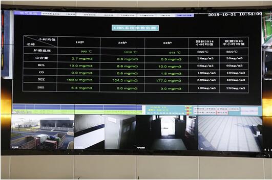 2018年10月31日上午,萬里行記者在紹興市垃圾焚燒發(fā)電廠中控室拍下該廠3臺(tái)正在運(yùn)行的焚燒爐煙氣中污染物的實(shí)測(cè)數(shù)據(jù),這些數(shù)據(jù)全部達(dá)到我國(guó)《生活垃圾焚燒污染控制標(biāo)準(zhǔn)》(GB18485-2014)的小時(shí)均值和《歐盟工業(yè)排放指令》(2010/75/EC)的半小時(shí)均值要求。比如:1號(hào)焚燒爐,爐溫為990℃,塵含量為2.7毫克/立方米,HCl為13毫克/立方米,CO為0毫克/立方米,NOX為169毫克/立方米,SO2為5.3毫克/立方米,都大大優(yōu)于2014國(guó)標(biāo)和2010歐盟標(biāo)準(zhǔn)。記者又來到廠區(qū)大門,看到湛藍(lán)的天空下一塊巨大的LED屏實(shí)時(shí)公布了污染物排放的實(shí)測(cè)數(shù)據(jù)。