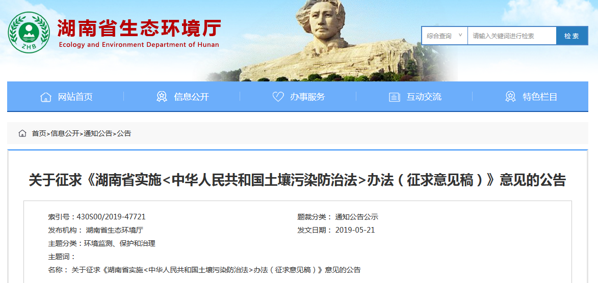 近日,湖南省生態(tài)環(huán)境廳發(fā)布《湖南省實施<中華人民共和國土壤污染防治法>辦法(征求意見稿)》,詳情如下:根據(jù)省人大立法計劃,我廳組織起草了《湖南省實施<中華人民共和國土壤污染防治法>辦法(征求意見稿)》(見附件)。為提高立法質量,現(xiàn)公開征求意見,請將修改意見通過傳真或電子郵件等...