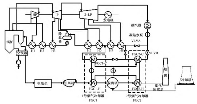 應(yīng)用蒸汽相變技術(shù)與氟塑料換熱器,設(shè)計(jì)了協(xié)同顆粒物脫除和水分回收的電站鍋爐煙氣余熱利用系統(tǒng)。系統(tǒng)在脫硫塔進(jìn)、出口設(shè)置兩級(jí)間接傳熱式煙氣冷卻器,氟塑料換熱器吸收的排煙余熱通過閉式循環(huán)水和板式換熱器傳遞給凝結(jié)水。一級(jí)煙氣冷卻器降低脫硫塔入口煙溫以減小脫硫水耗,二級(jí)煙氣冷卻器冷凝煙氣中的水蒸氣并脫除煙氣中的...