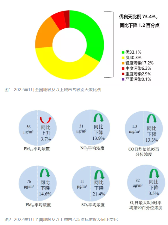 生態(tài)環(huán)境部今日向媒體通報了2022年1月全國環(huán)境空氣質量狀況。 總體情況 1月,全國339個地級及以上城市平均空氣質量優(yōu)良天數(shù)比例為73.4%,同比下降1.2個百分點;PM2.5平均濃度為56微克/立方米,同比上升3.7%;PM10平均濃度為76微克/立方米,同比下降14.6%;O3平均濃度為82微...