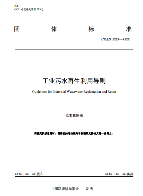關(guān)于征求團(tuán)體標(biāo)準(zhǔn)《工業(yè)污水再生利用導(dǎo)則(征求意見稿)》意見的函 由我會組織編制的團(tuán)體標(biāo)準(zhǔn)《工業(yè)污水再生利用導(dǎo)則》已完成征求意見稿,根據(jù)《中國環(huán)境科學(xué)學(xué)會標(biāo)準(zhǔn)管理辦法(試行)》的有關(guān)規(guī)定,現(xiàn)公開征求意見。請?zhí)顚懸庖姺答伇?,并?022年7月13前將有關(guān)意見反饋我會(電子文檔請同時發(fā)送至聯(lián)系人郵箱)。 ...