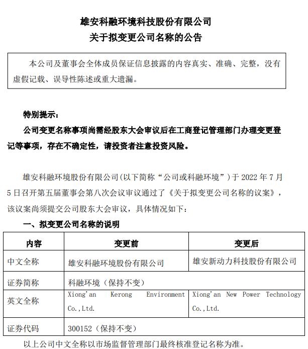 2022年7月5日,雄安科融環(huán)境科技股份有限公司發(fā)布《關(guān)于擬變更公司名稱的公告》。 科融環(huán)境擬更名為“雄安新動(dòng)力科技股份有限公司”,證券簡(jiǎn)稱不變,證券代碼不變。(公司中文全稱以市場(chǎng)監(jiān)督管理部門最終核準(zhǔn)登記名稱為準(zhǔn)) 科融環(huán)境表示,更名原因在于公司自2010年IPO以來,業(yè)務(wù)從...