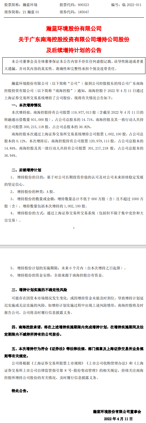 2022年4月11日,瀚藍(lán)環(huán)境股份有限公司(下稱“瀚藍(lán)環(huán)境”)發(fā)布公告稱,廣東南??毓赏顿Y有限公司(下稱“南海控股”)已成功通過上海證券交易所交易系統(tǒng)增持了股份。 據(jù)了解,本次增持前,南??毓沙钟绣{(lán)環(huán)境14.71%的股份,及其一致行動(dòng)人共持有瀚藍(lán)環(huán)境...