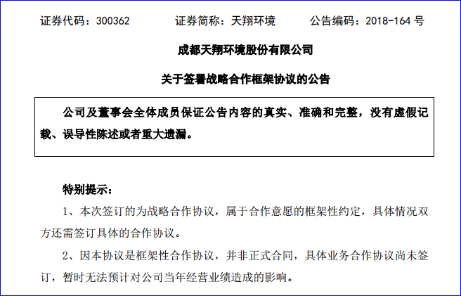 2018年12月24日,天翔環(huán)境公告稱,公司與四川能投水務(wù)投資有限公司在12月21日已經(jīng)正式簽訂了《戰(zhàn)略合作框架協(xié)議》。此次戰(zhàn)略合作協(xié)議的簽訂,意味著陷入債務(wù)泥淖的天翔環(huán)境,再次迎來又一家地方國資的的“馳援”。 根據(jù)協(xié)議內(nèi)容,雙方擬在本協(xié)議正式簽署后組建專業(yè)團(tuán)隊(duì),對(duì)所涉及合作...