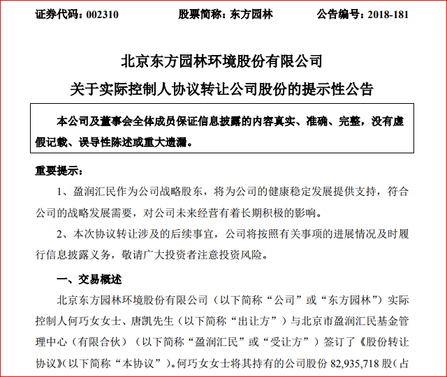 12月9日,東方園林發(fā)布公告,公司實(shí)際控制人何巧女、唐凱與北京市盈潤(rùn)匯民基金管理中心(簡(jiǎn)稱“盈潤(rùn)匯民”)簽訂了《股份轉(zhuǎn)讓協(xié)議》。 根據(jù)協(xié)議,何巧女將其持有的公司股份 82,935,718 股(占公司總股本的 3.09%)、唐凱將其持有的公司股份 51,337,383 股(占公...