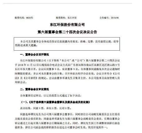 東江環(huán)保發(fā)布公告,于2018年11月12日舉行的第六屆董事會(huì)第24次會(huì)議,董事會(huì)選舉譚侃為第六屆董事會(huì)董事長,任期自董事會(huì)審議通過之日起至本屆董事會(huì)屆滿之日止。董事會(huì)選舉譚侃為第六屆董事會(huì)戰(zhàn)略發(fā)展委員會(huì)主席,選舉鄧謙為第六屆董事會(huì)戰(zhàn)略發(fā)展委員會(huì)委員,與曲久輝共同構(gòu)成第六屆董事會(huì)戰(zhàn)略發(fā)展委員會(huì)。董事會(huì)...